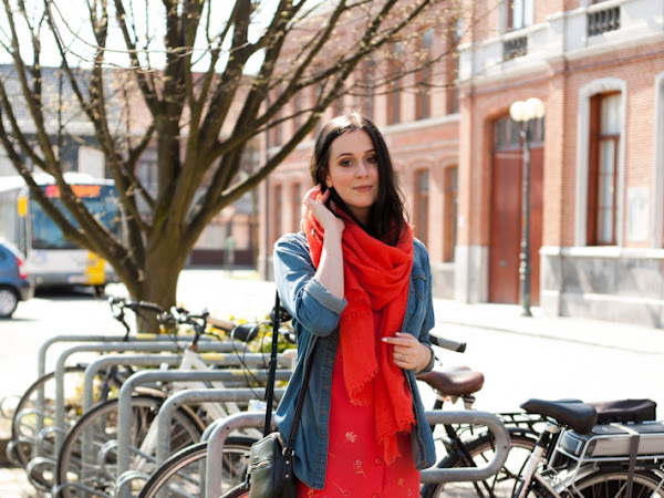 Outfit: red off shoulder dress and mosaic patterned Torfs sneakers